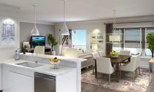 When you choose your apartment, you’ll also choose from high-end finishes such as crown moldings and wide plank flooring. The open floor plan enhances mobility and adds natural beauty to the space. Elegant lighting features illuminate the adjoining dining room and kitchen.